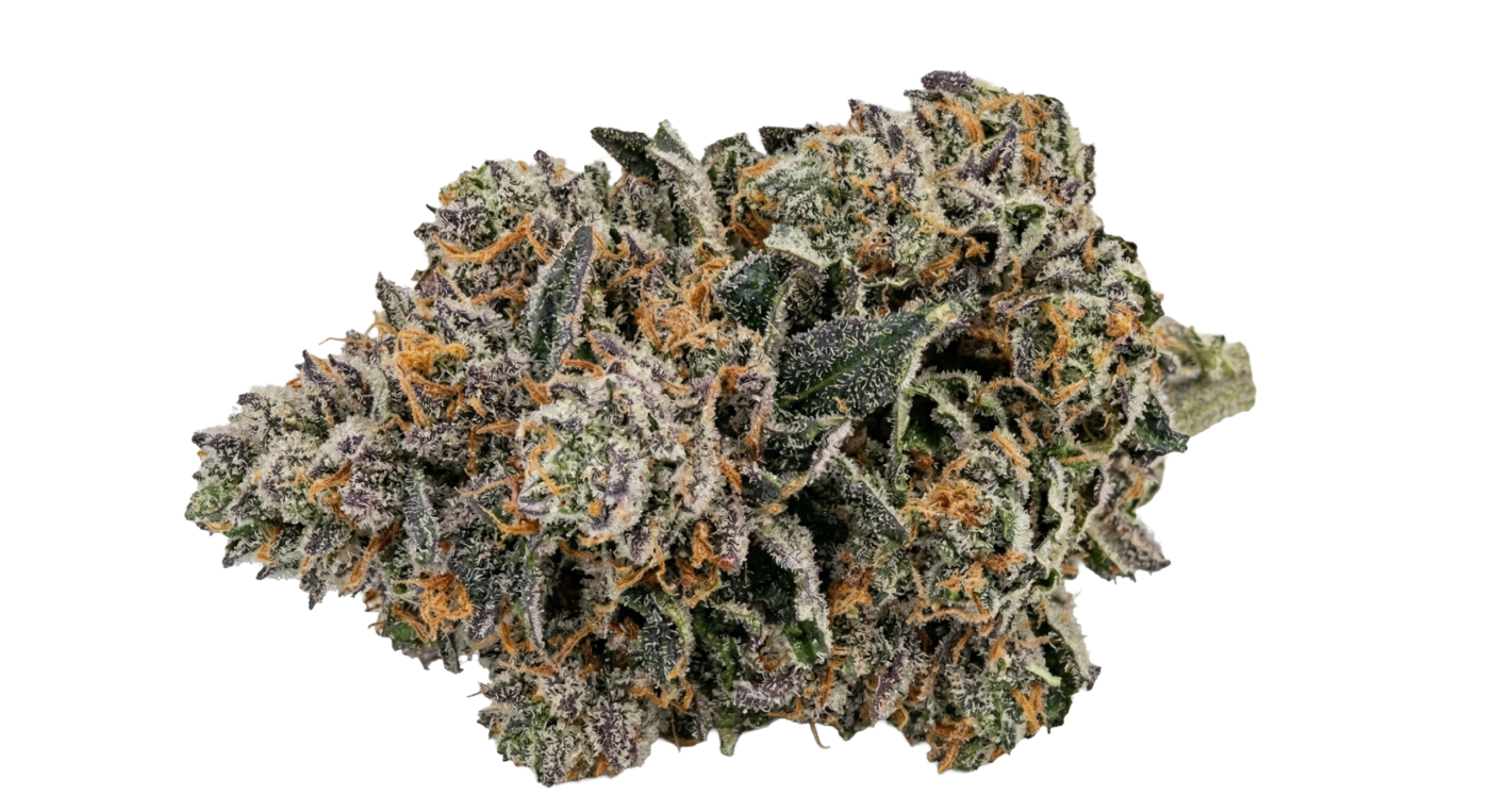 • Appearance: Striking, shelf-stopping bag appeal. These remarkably dense, chunky buds are a visual feast of deep emerald greens woven with dramatic, striking flashes of dark violet and amethyst. The flower is completely encrusted in a blinding, thick blizzard of crystalline white trichomes, beautifully accented by fiery orange pistils.